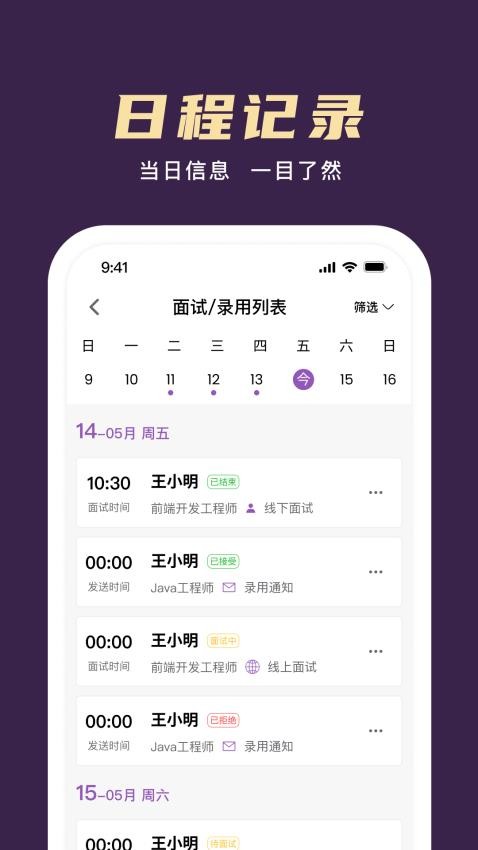 1、自带完善日程记录管理功能,可在线编辑留存每日面试工作安排,合理规划日常事务,有效防止工作计划出现遗漏。