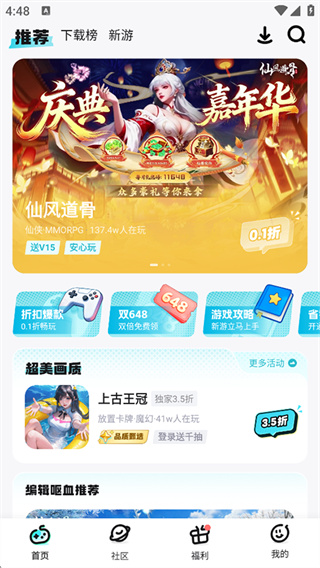 1、首页可浏览不同游戏内容及相关活动。