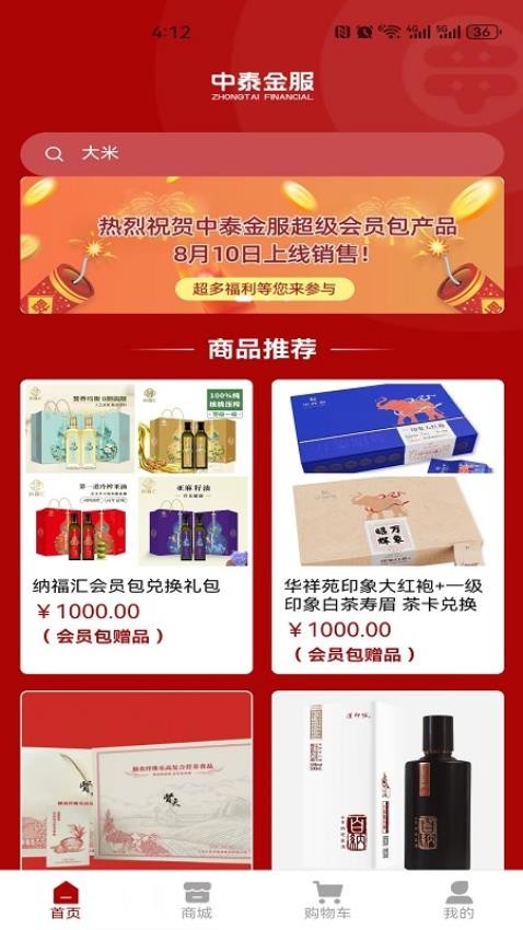 中泰金服是以一站购物为主要功能的购物应用。划分出百汇、茶品、佳酿、粮油、生鲜、珠宝、文教等专属区域,每个区域的商品都配有清晰详实的介绍,便于精准锁定心仪物件。选好的物件可直接归集到统一区域,一次性完成全部结算流程,省去反复操作的繁琐,不用辗转各处就能采齐所需各类物件。