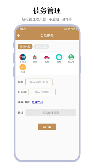 4、在欠款记录填写页面,选择欠款类型等信息,点击【记一笔】按钮完成欠账记录。