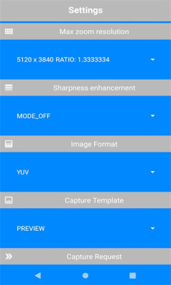 4、在“Settings”页面,可对【CaptureRequest】【SurfacesCache】等功能项进行开关设置,调整应用参数。