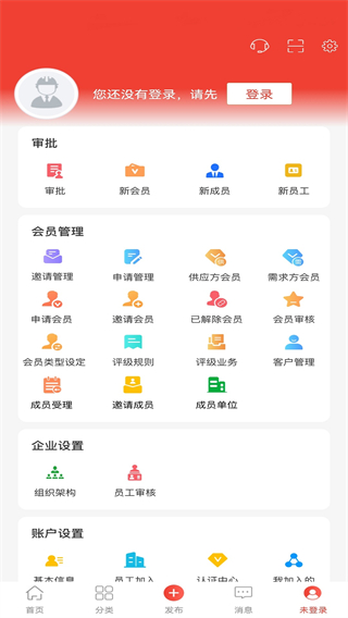 1、打开经营帮会员应用,点击首页底部右侧的【未登录】按钮,进入个人功能页面。
