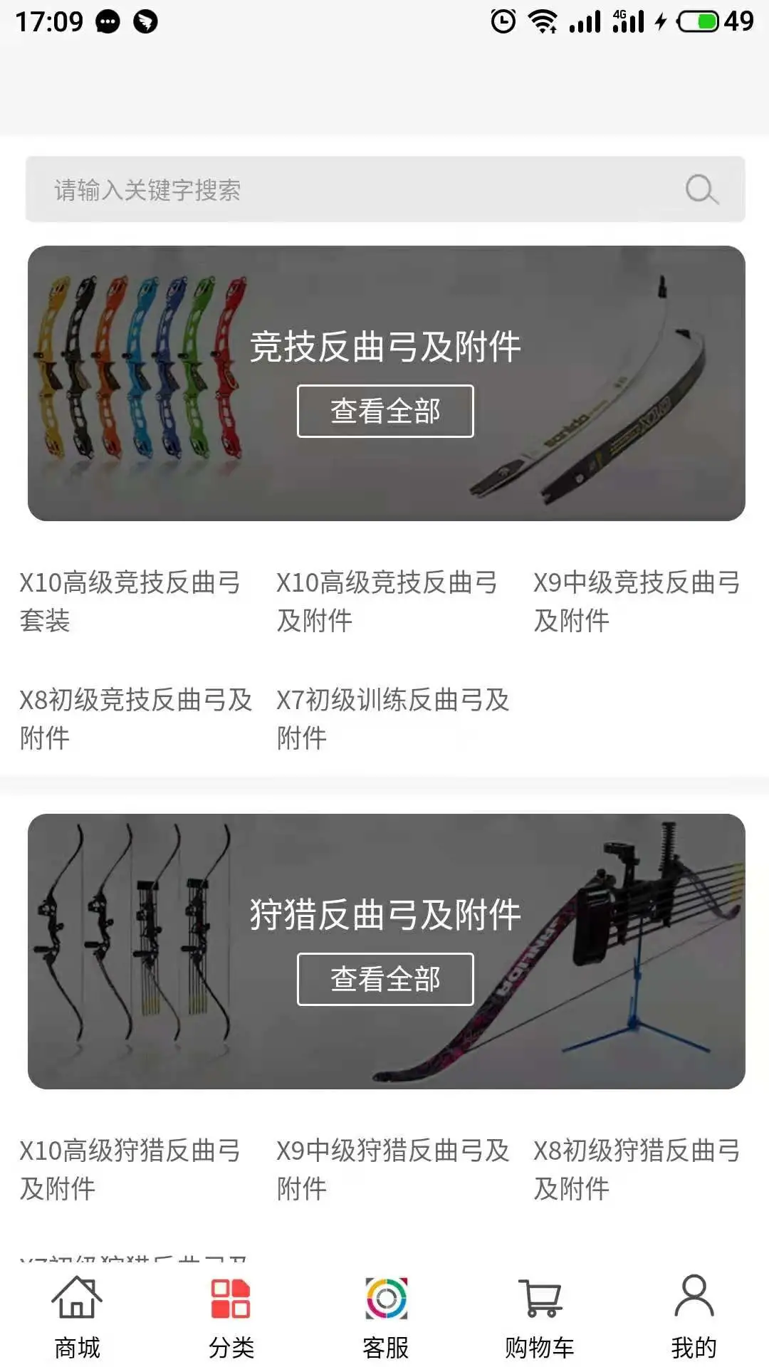 2、进入【分类】页面后,可查看不同品类的商品(如竞技反曲弓及附件),点击对应品类的【查看全部】可进入该类商品列表页。