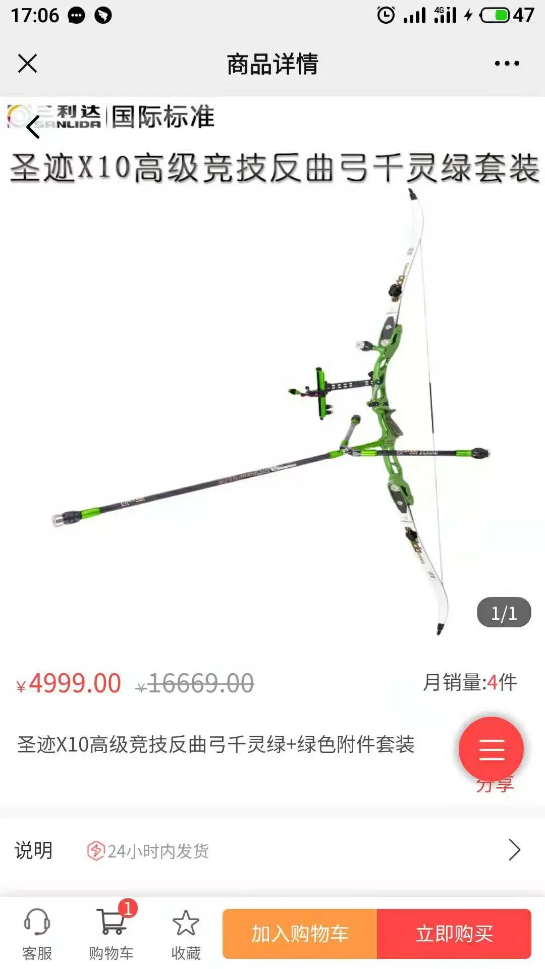 4、进入商品详情页(以唐宗初学者反曲弓套装为例),可查看商品信息、规格,点击【加入购物车】或【立即购买】完成选购操作。