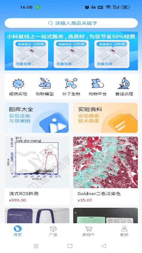 1、进入【小科鼠商城】主界面,点击【动物实验】分类入口,进入对应科研用品列表页。