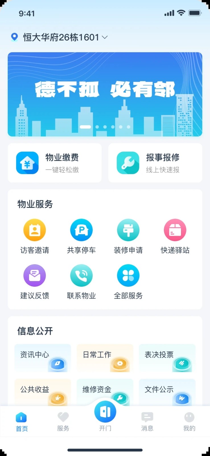 5、平台功能集中且操作简便,房产绑定后一键使用各项服务,为业主日常居住带来全方位便利。