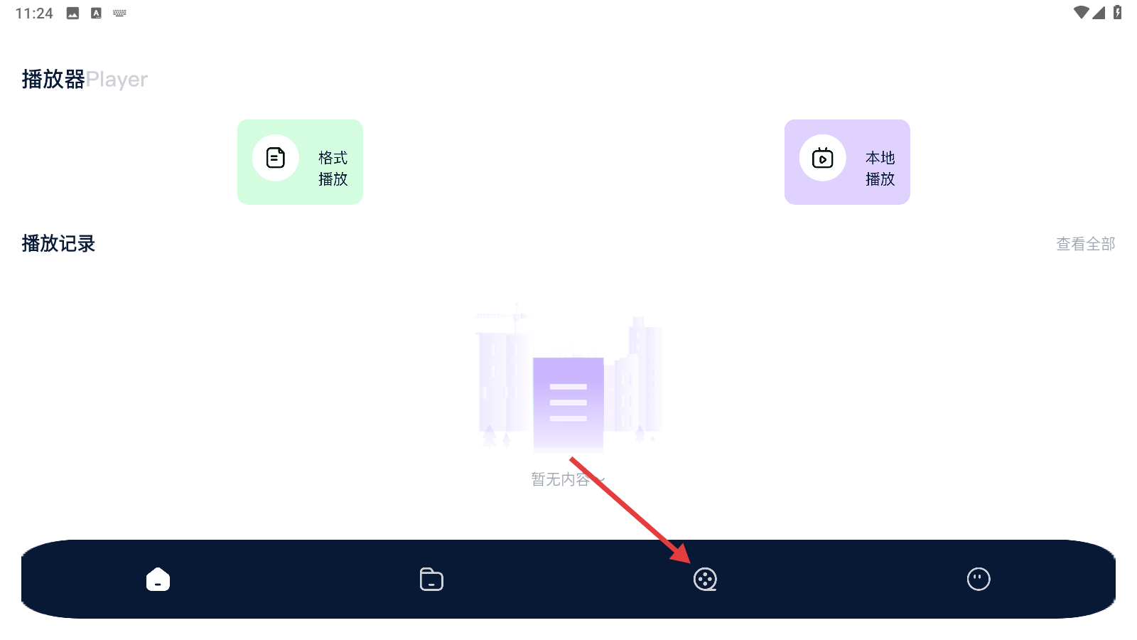 1、点击底部【影视图标】,从播放器界面切换至【影视推荐】页面,开启影视内容浏览。