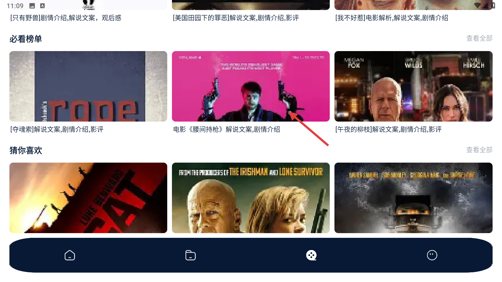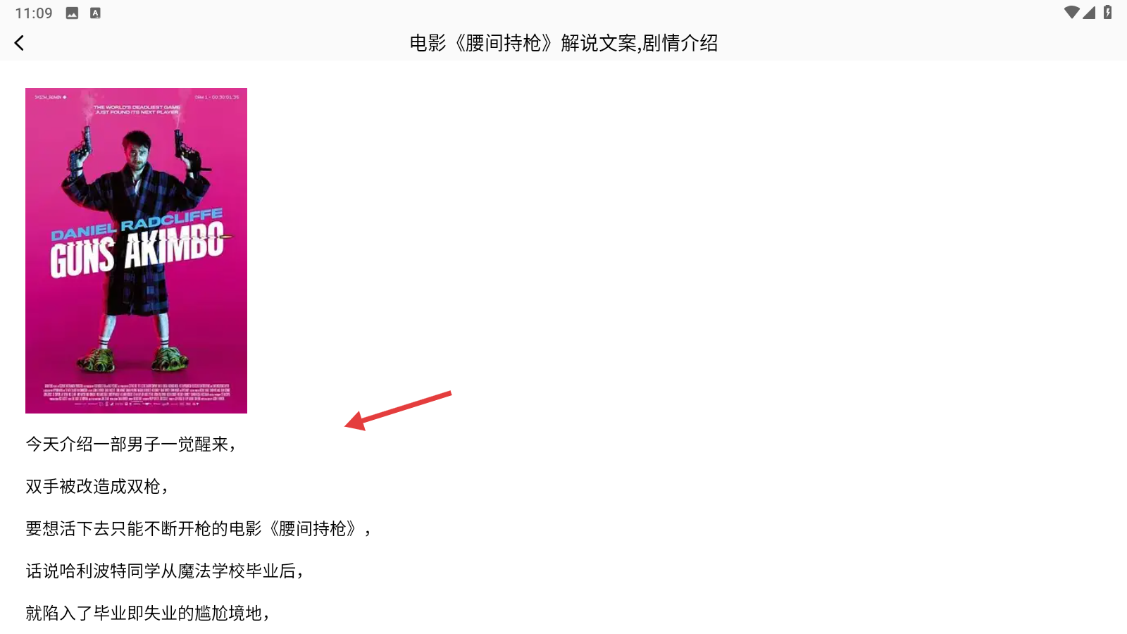 2、在推荐页选中【电影-腰间持枪】条目,进入该影视的解说文案与剧情介绍详情界面。