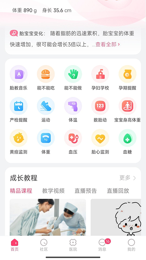 1、进入首页可查看胎宝孕周(如【6周+0天】)、发育数据,点击底部【社区】按钮,可进入孕期交流板块。
