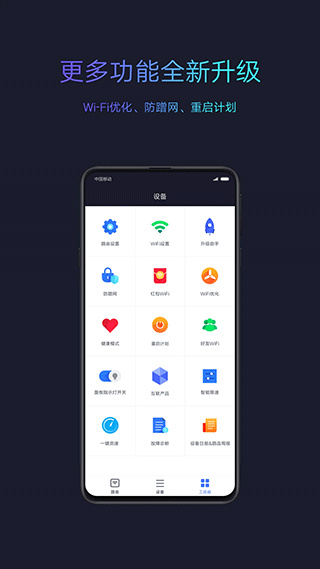 小米路由器是一款专门用来管理小米路由器的手机工具,用户不需要一直守在电脑前即可直接在手机上就能把家里的网络情况看得明明白白,例如当前的网速状态、设备连接是否正常、网络运行状态如何,只需一键打开即可掌握所有网络信息,并且如果家里的信号不稳定且网速非常慢,还能够帮助用户排查问题所在,即使在外出的时候也可以随时查看路由器的连接状态。