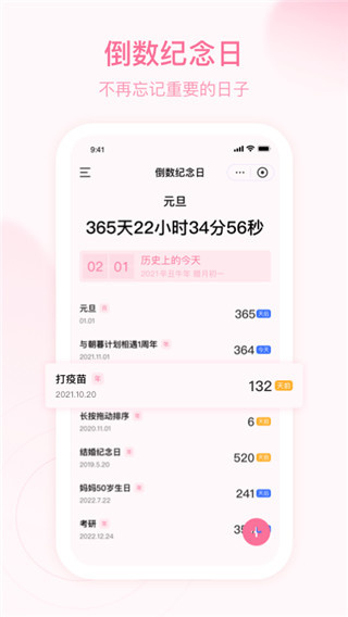 3、倒数纪念日功能会提醒重要的日子,像家人生日或者节日都不会忘记,还可以自定义头像和背景图片。