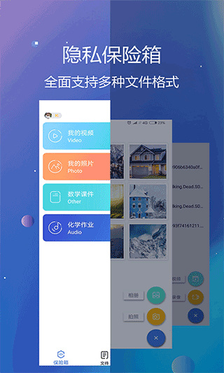 1、图片文本音乐视频各种格式全都能隐藏,手机里大部分私密文件都能保护起来;
