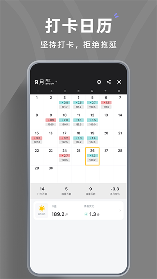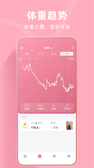 1、每天记录体重后系统会自动整理数据变化,通过趋势图慢慢看到体重长期变化情况。