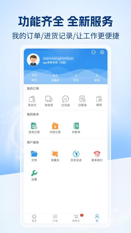 1、分类页陈列了全品类五金商品供你挑选,点击底部导航栏的【我】就能进入个人中心界面。