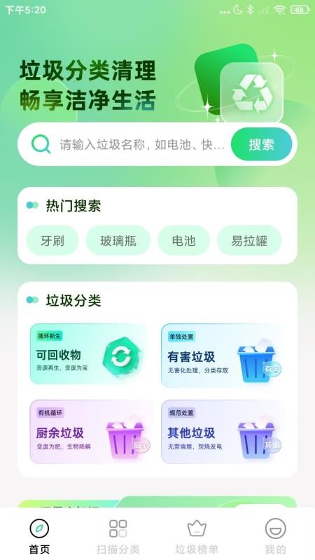 1、进入应用首页后,你可以在顶部【搜索栏】输入垃圾名称,或是点击热门搜索词条快速发起查询。