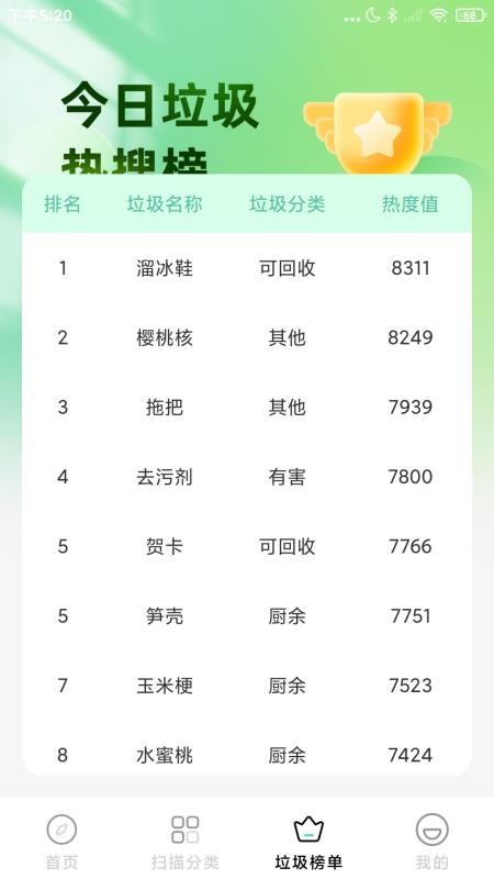 4、你也可以进入【垃圾榜单】页面,查看近期高频查询的垃圾分类,掌握更多实用的垃圾分类知识。