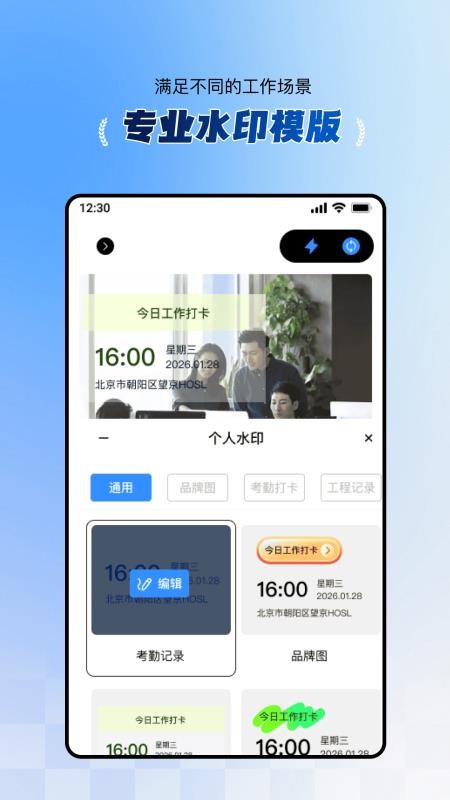 2、在水印列表的【考勤打卡】分类下,找到想要使用的水印模板,点击编辑按钮进入自定义设置页面。