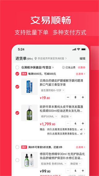 2、打造一站式买卖服务模式,覆盖分销全流程操作,为商家提供高效便捷的线上采购与经营综合服务。