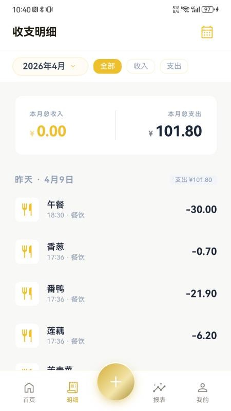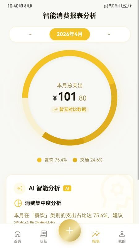 4、记账完成后可进入报表页面,查看【消费报表分析】,清晰掌握近期各时段收支结构与自身消费习惯。