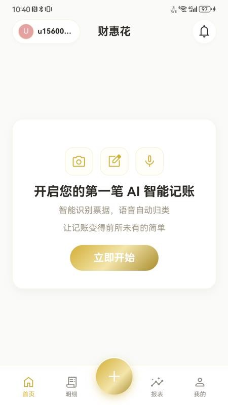 1、打开财惠花进入首页,点击底部中央的【+】按钮,即可进入记账选择界面,快速开启个人账单记录流程。