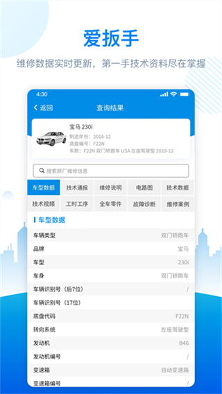 2、整合汽车制造厂商与后市场全维度维修数据,实现汽修相关信息统一查询,降低专业数据获取的整体难度。