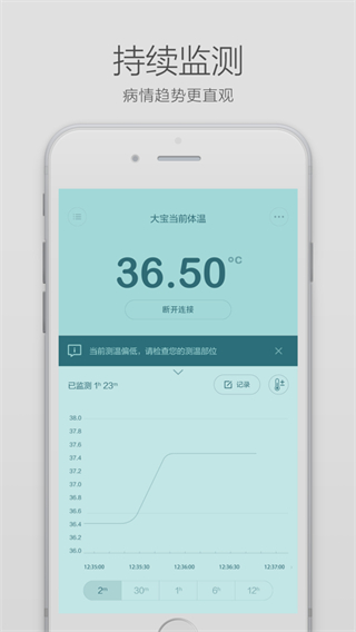 1、连续式体温监测突破传统测量限制,长时间记录数据,全面掌握儿童体温变化规律与趋势。