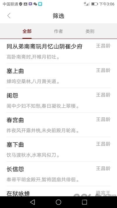 3、此外,用户还可以按照不同的分类进行浏览,如山水田园、边塞征战、咏史怀古等,方便用户根据个人兴趣进行选择。