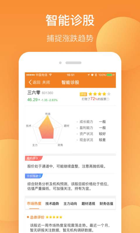 3、智能选股:根据用户的投资偏好和风险承受能力,智能推荐潜力个股,提供个性化的投资组合建议。