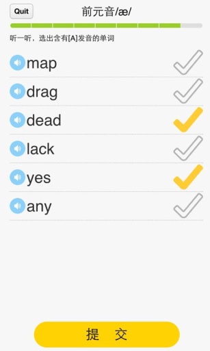 3、丰富的练习题目,包括听音选音标、看音标发音等多种题型,帮助用户巩固所学知识,提高实际应用能力。