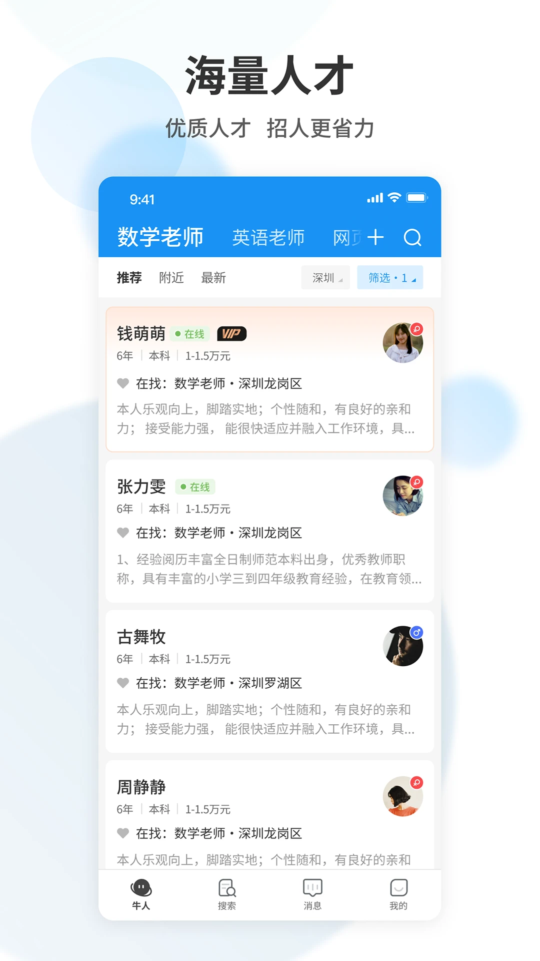 1、具备强大搜索功能,可根据学科-年级-地区等关键词,快速匹配符合需求的教师或职位。