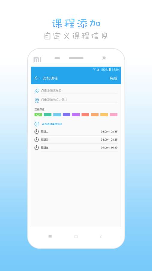 1、满分课程表提供强大的课程管理功能,用户可以快速录入课程信息,包括课程名称、上课地点、授课教师等,并支持自定义课程颜色和备注。