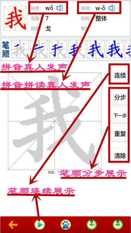 2、每个汉字都配有清晰的书写演示和标准的发音,让孩子们可以边听边学,提高学习效率。