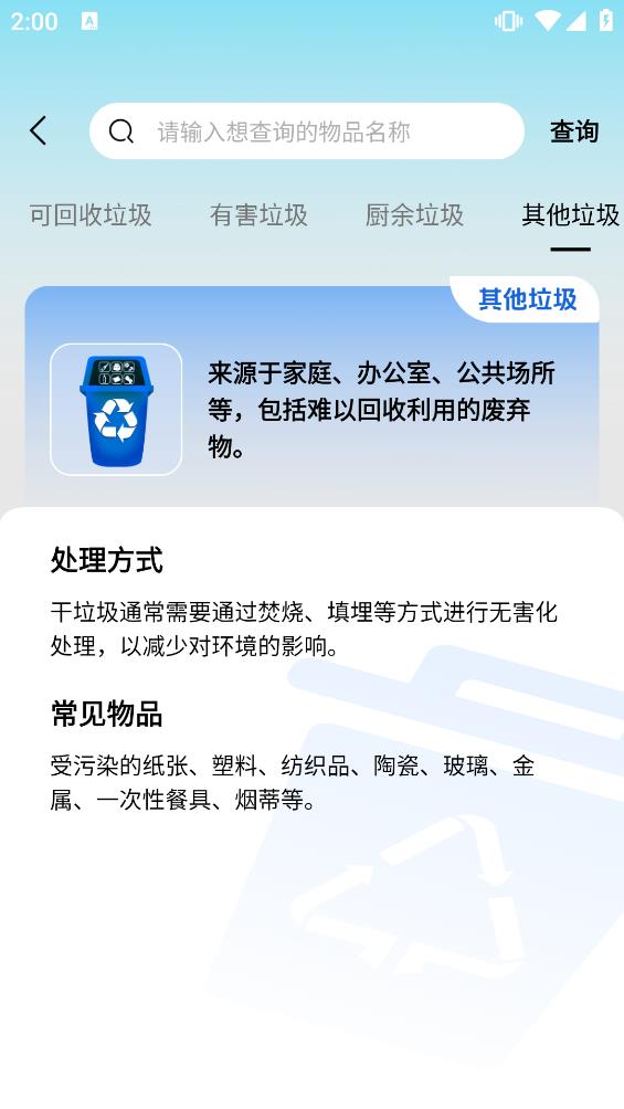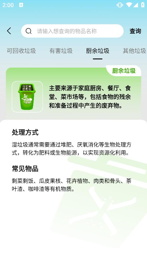 1、垃圾分类查询助手-京沪垃圾通提供了一键查询功能,用户只需输入垃圾名称或通过拍照识别,即可迅速获取垃圾所属类别。