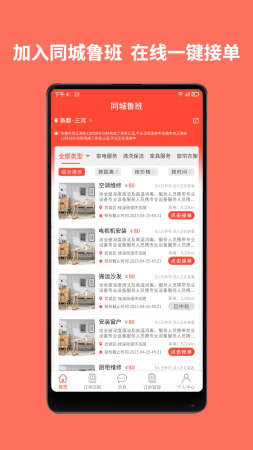 同城鲁班师傅端APP,作为一款致力于提升城市生活维修服务效率的应用,为广大用户提供了便捷、高效的家居维修解决方案。通过该平台,用户可以轻松找到专业的鲁班师傅,解决家中遇到的各类维修难题。无论是水电维修、家具安装,还是家电维修等,同城鲁班师傅端都能精准匹配用户需求,让维修服务变得简单又省心。