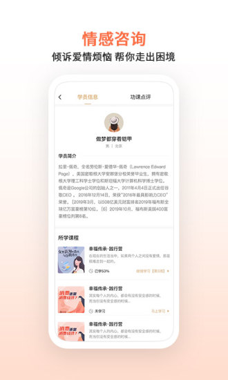 2、平台内拥有丰富多样的情感课程,涵盖恋爱、婚姻、亲子等多个领域,用户可以根据自己的需求选择相应的课程进行学习。