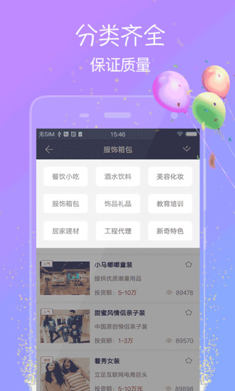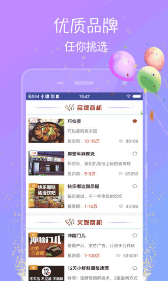 2、APP内置了智能匹配系统,能够根据您的资金、经验等条件,为您推荐最合适的加盟项目。