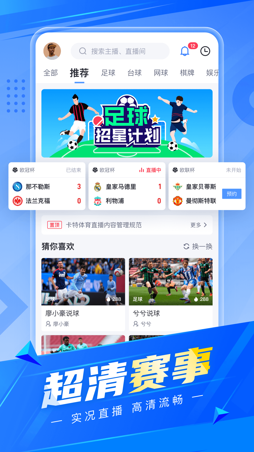 1、卡特体育APP提供了实时赛事直播功能,用户可以通过手机随时观看国内外各大体育赛事,感受紧张刺激的比赛氛围,与其他球迷共同分享观赛的乐趣。