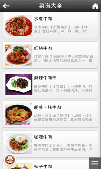 1、郫县牛肉APP提供了详尽的菜谱功能,用户可以浏览到各种以郫县牛肉为主材的川菜做法,步骤详细,易于操作。
