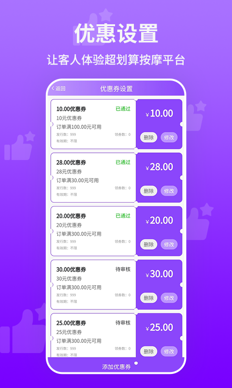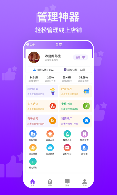 想按摩商户端APP,专为按摩行业商户设计的一款应用。通过这款APP,商户可以轻松管理预约、订单、客户信息,提升经营效率。同时,想按摩商户端还提供了丰富的营销工具和数据报表,帮助商户更好地了解经营情况,制定合适的营销策略。