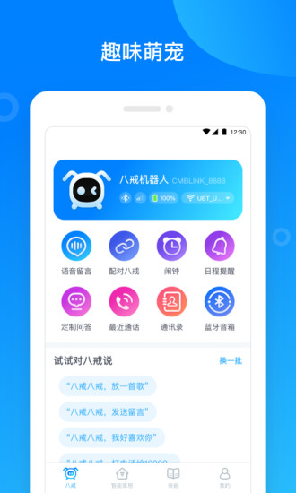 2、互动娱乐:该APP提供了多种娱乐功能,如语音聊天、讲故事、播放音乐等。用户可以与八戒机器人进行有趣的互动,增添生活乐趣。