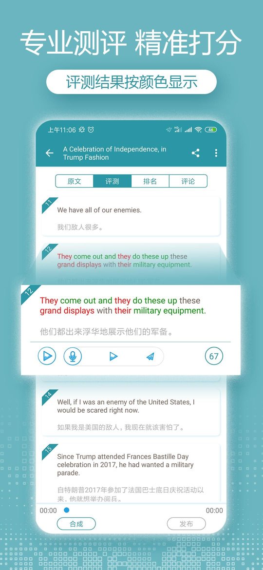 1、该APP具备专业的语音识别技术,可以实时对用户的发音和听力水平进行评估,为用户提供个性化的学习建议。