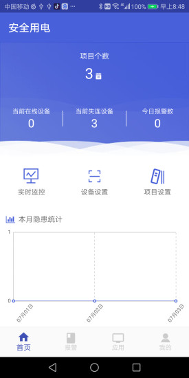 当前版本主要包含四个部分,首页及实时监控、报警记录、应用及用户中心。其中应用又有隐患处理、日程巡检和分析报告等功能。