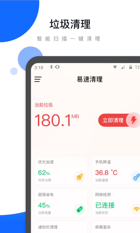 1、易速清理APP提供了一键清理功能,用户只需点击一下,即可自动扫描并清除手机中的缓存、残留文件和无用安装包,释放大量存储空间。