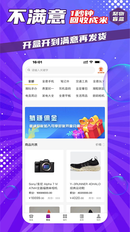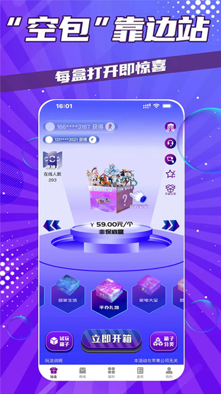 1、聚物盲盒APP提供了多样化的盲盒选择,涵盖电子产品、生活用品、时尚配饰等各类商品,满足不同用户的购物需求。