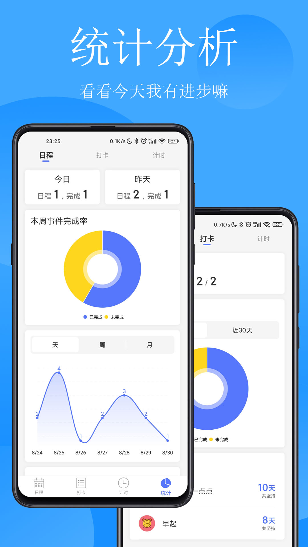 3、进度跟踪:实时更新任务进度,以图表形式直观展示打卡统计数据,方便用户随时掌握个人动态。