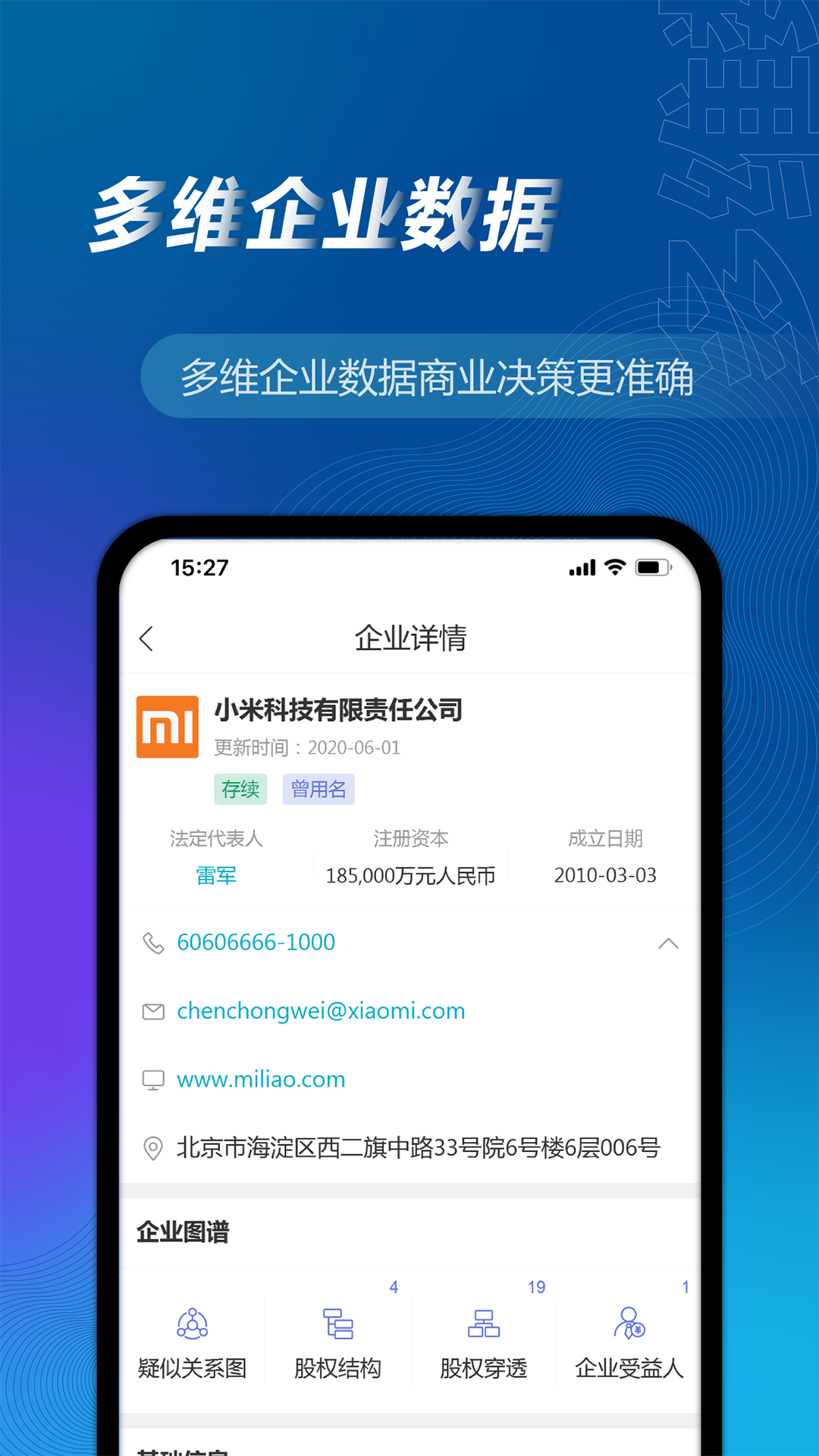 2、信息详情:展示企业的基本信息、股东结构、主要人员、变更记录等,帮助用户全面了解企业状况。