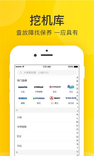 2、进入【资料库】页面后,在【热门品牌】板块选对应挖机品牌,如【HITACHI-日立】【CATERPILLAR-卡特彼勒】,定位对应机型资料。