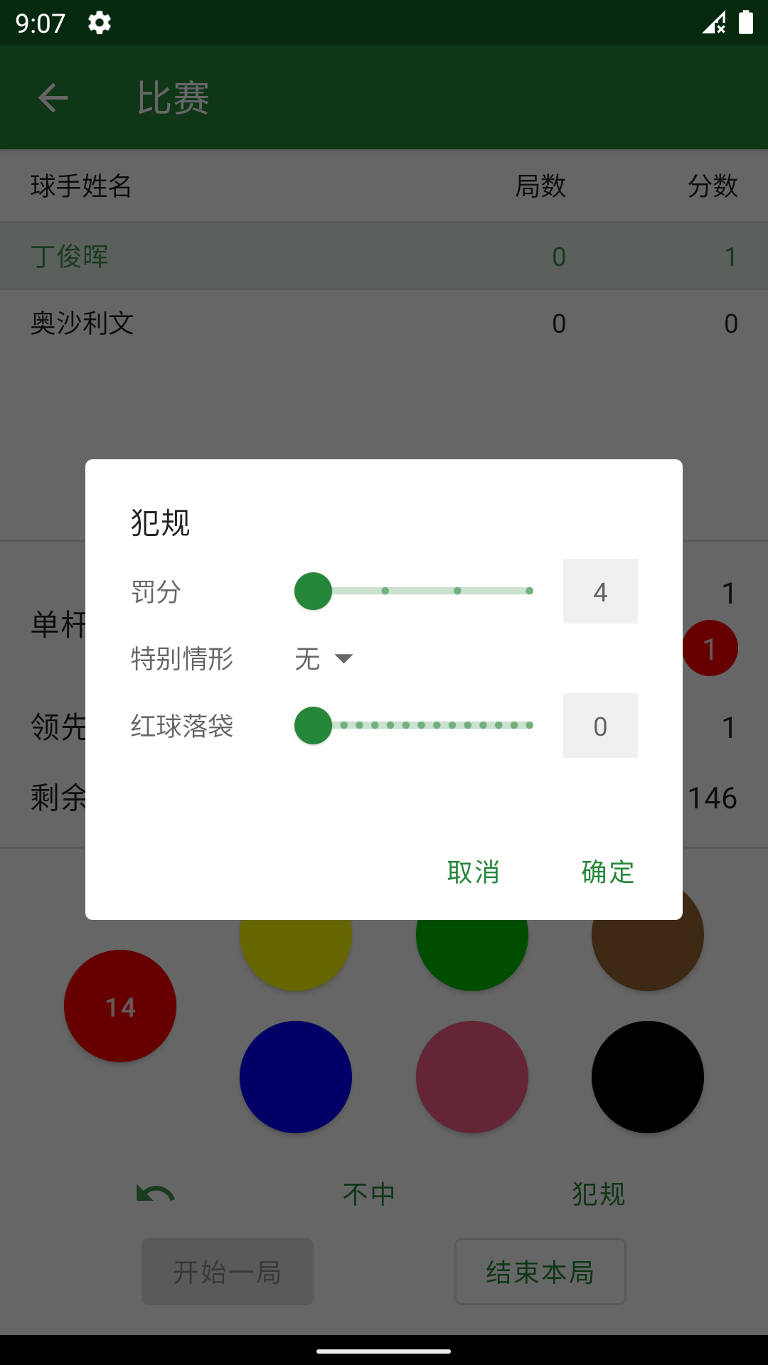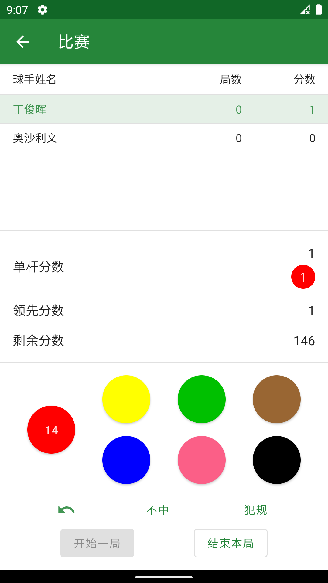 3、在对局中点击【红球-15】,选择【不中】【犯规】等选项,记录击球结果与分数变化。