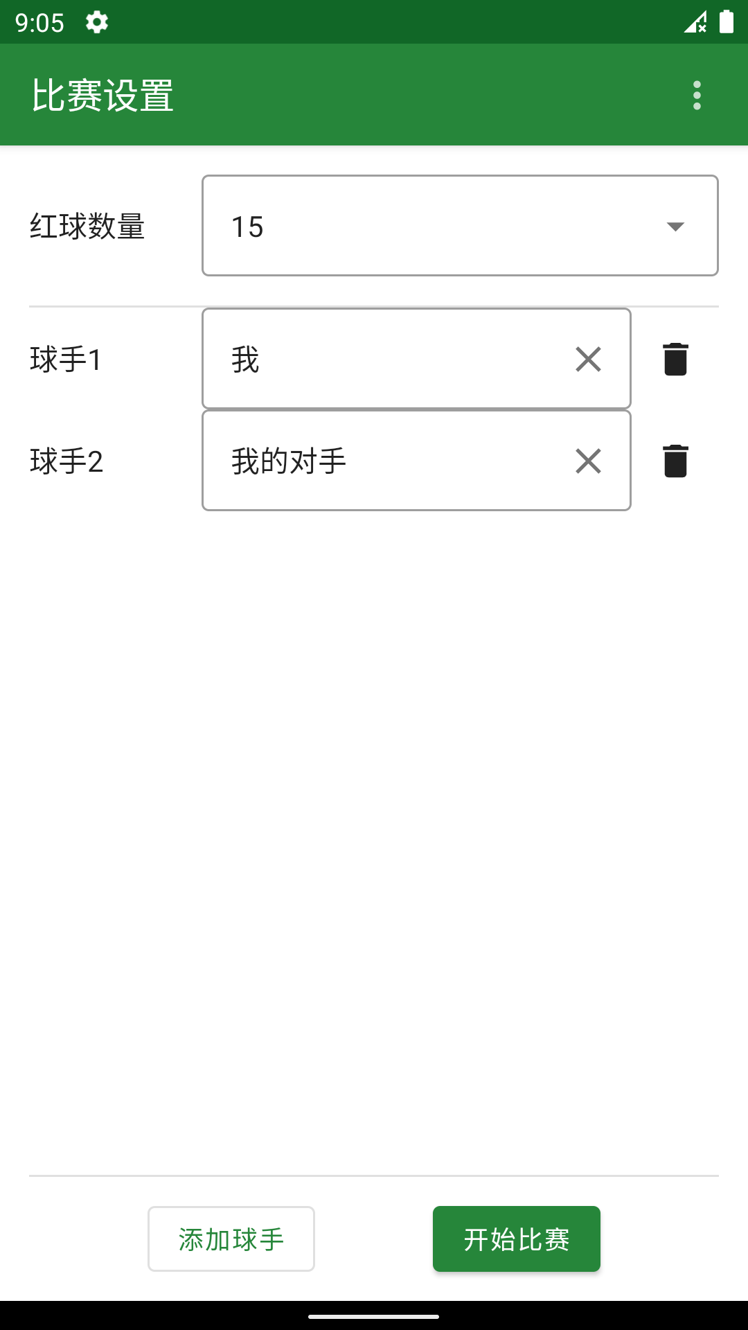 1、在【比赛设置】界面设置【红球数量-15】,填写【球手1】和【球手2】信息,点击【开始比赛】。