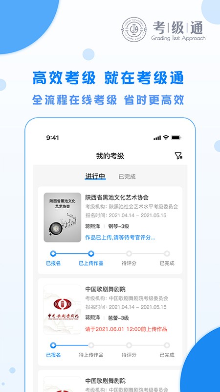 2、打通线上服务与线下机构资源,结合线上存储查询与线下场地服务,完善全流程考级体验。